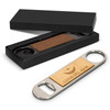 Stylish and functional bottle opener that features a metal bar blade and a wooden front. The back of the opener is equipped with a magnet, allowing you to easily store it on your refrigerator or other metal surface. It is presented in an individual black box.