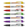 Retractable plastic ballpoint pen with a spring-loaded banner which can be branded in full colour on both sides. The pen has a soft rubber grip, translucent trim, and 1200m of German manufactured Dokumental ink. The refill is available in blue or black ink. A production lead time of 40 working days applies to this product by air freight and larger orders can be sea freighted on request to reduce the freight cost.
