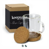 Design inspired 350ml double wall, shatter-resistant borosilicate glass coffee cup with a natural cork lid that doubles as a coaster. The coffee cup is presented in a natural gift box with a branded black sleeve.