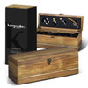 Stunning wine gift set in a natural acacia wood presentation box with a secure swing clasp closure. The box has foam cushioning with a fabric lining to fit and protect a range of wine bottles. The gift set includes a foil cutter, wine aerator, wine stopper and a corkscrew. The aerator, stopper and corkscrew are all made featuring acacia wood. This sophisticated gift set is presented in a natural gift box with a Keepsake branded sleeve.