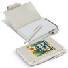 Pocket-size (approximately A6) notebook in a compact case made from a blend of natural wheat straw fibre and ABS plastic. The notebook includes a pen that locks the case closed when in the pen holder, and features a pad with 80 leaves of unlined paper.