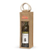 Single bottle wine carry bag which is manufactured from laminated natural jute with unbleached cotton handles and a clear PVC front panel.