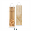 Elegant wine gift box made from natural pine wood with a sliding lid. The box is designed to hold one standard wine bottle and has built-in dividers with shredded paper filling. A woven cotton rope handle makes it easy and comfortable to carry.