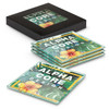 Set of four square glass coasters in a stylish black gift box with a window to show off the brand. The coasters have four non-marking polyurethane pads on the base. The branding is on the underside of the coaster and handwashing is recommended.